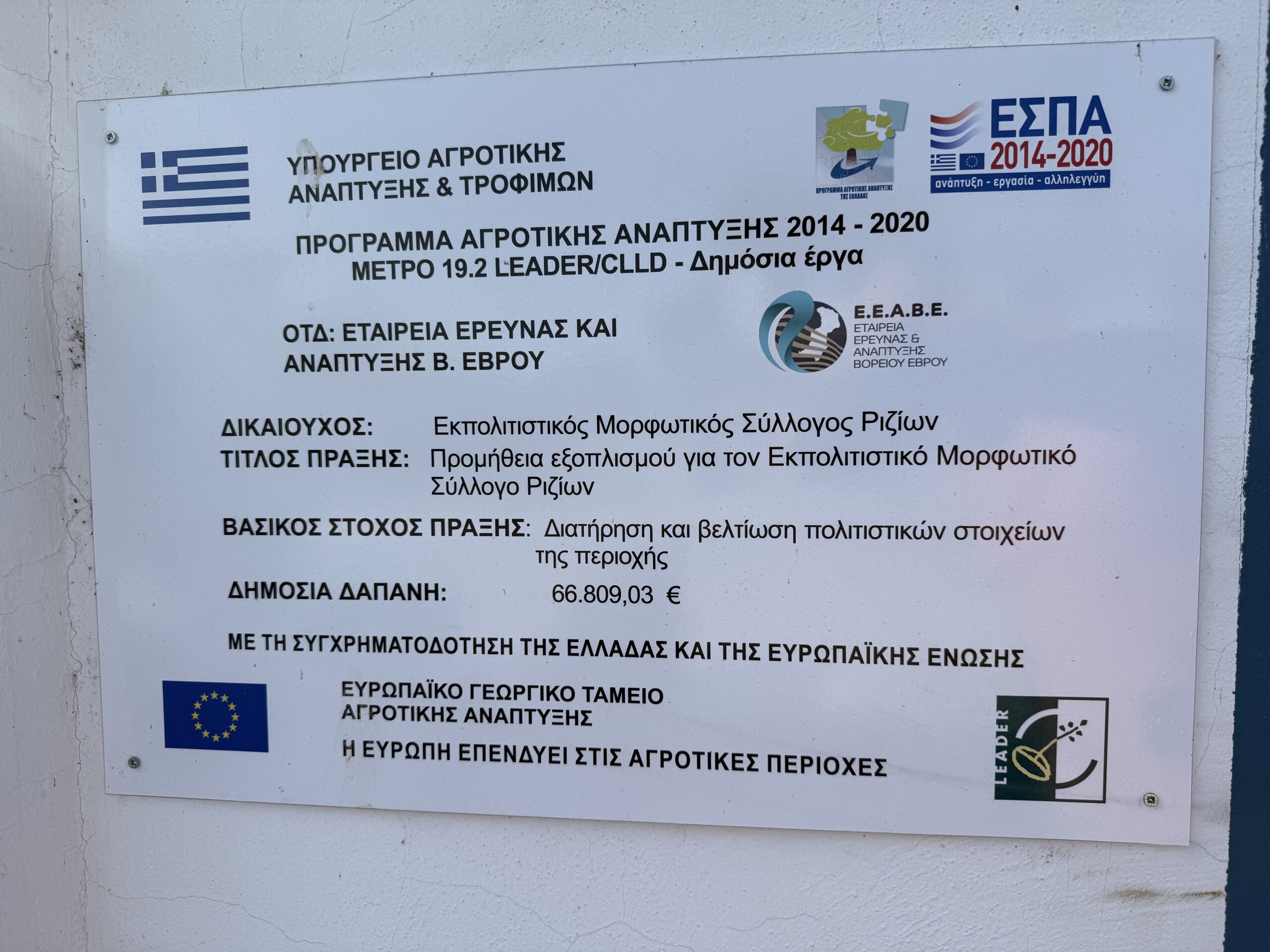 ΠΡΟΜΗΘΕΙΑ ΕΞΟΠΛΙΣΜΟΥ ΓΙΑ ΤΟΝ ΕΚΠΟΛΙΤΙΣΤΙΚΟ, ΜΟΡΦΩΤΙΚΟ ΣΥΛΛΟΓΟ ΡΙΖΙΩΝ. Δημοσίας Δαπάνης 11.690,51€, τελική πληρωμή.
