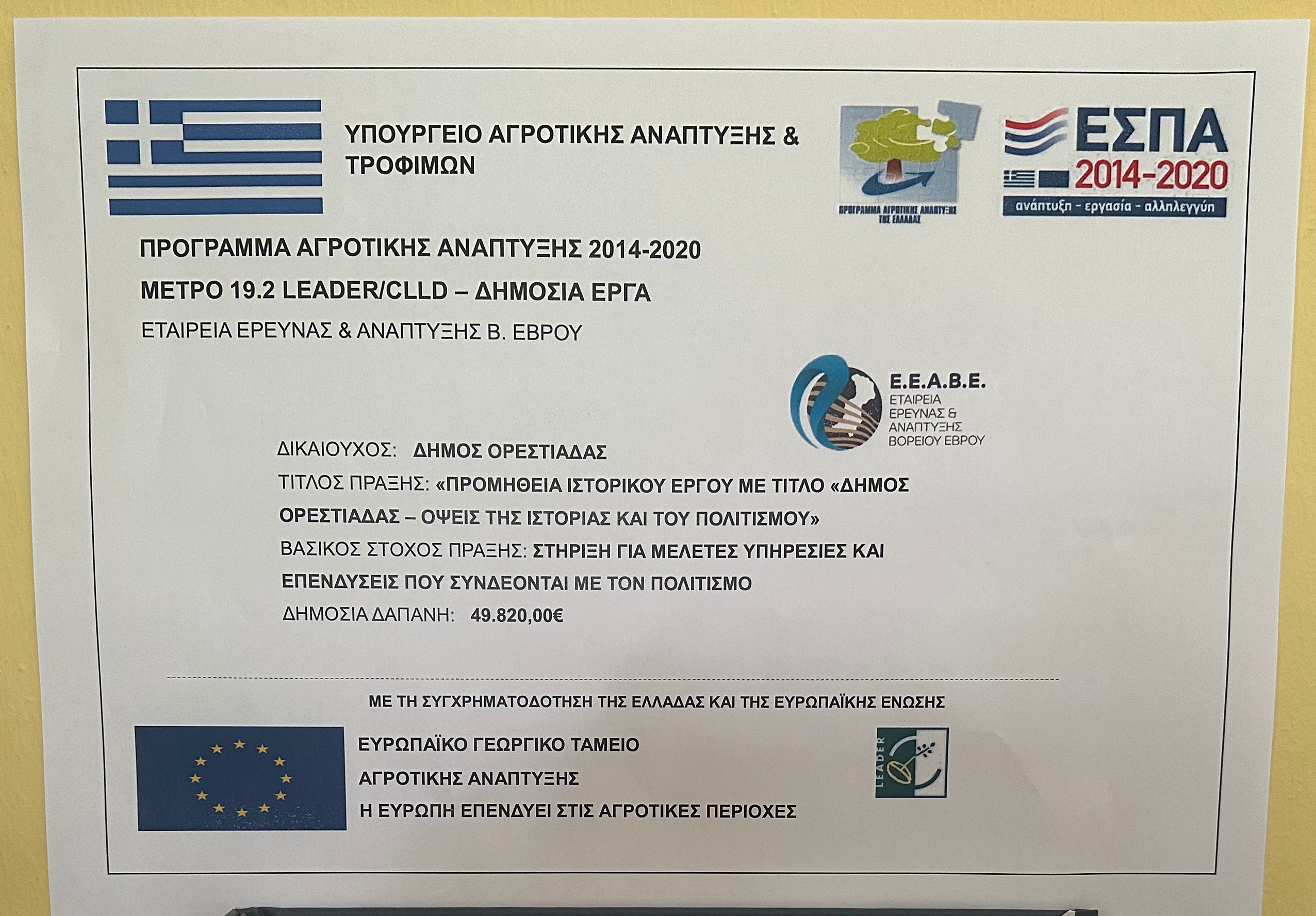 Τελική πληρωμή 47.488,00€ στο τοπικό πρόγραμμα CLLD/LEADER της Εταιρείας Έρευνας και Ανάπτυξης Βορείου Έβρου – Αναπτυξιακή Ανώνυμη Εταιρεία ΟΤΑ (ΕΕΑΒΕ)